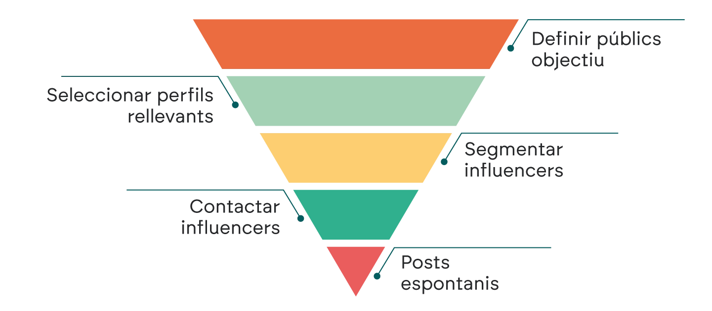 La metodologia del "Hunting d'Influencers" segueix cinc passos clau. En primer lloc, es defineix clarament el públic objectiu del producte o servei. Seguidament, es seleccionen perfils rellevants basats en objectius comunicatius, tipus de contingut i abast, mitjançant Social Media Listening. En la tercera fase, es segmenten els influencers en categories pertinents, considerant la seva afinitat amb la marca i el seu nivell d'engagement. Posteriorment, s'estableix contacte amb els influencers inicialment a través de xarxes socials i després per correu electrònic per formalitzar la proposta de col·laboració. Finalment, es busca que els influencers seleccionats generin contingut autèntic que integri el producte de manera natural en les seves activitats quotidianes, destacant les seves característiques distintives.